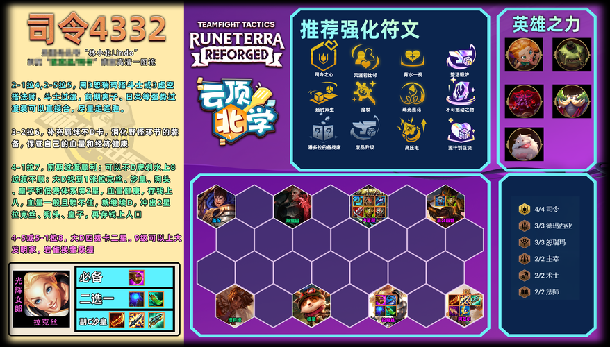 金铲铲之战S5变形重组器的玩法主要包括以下几点:英雄之力选取 选取塔姆:在金铲铲之战S5赛季中,选取塔姆作为英雄之力,可以使得海克斯的选取更加符合自己的战术需求。 经济类海克斯:在海克斯选取阶段,优先考虑选取经济类海克斯,为后期D四费卡打下坚实的基础。