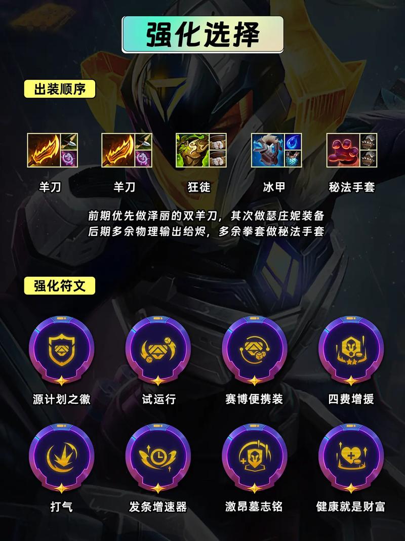 〖Three〗、主宰尼菈核心为6主宰羁绊,需主宰文章纹章支持。尼菈必做火炮,沙皇副C需纳什之牙+法爆,狗头携带薄暮法袍提升尼菈输出。过渡依赖2主宰2挑战2祖安,打工核心为金克丝+狼人+莎弥拉,优先连胜。崔斯特传说之力强化装备获取,城邦优先选经济类。