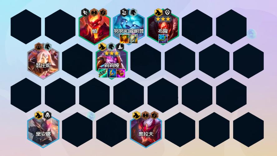 〖Six〗、前排:屠?勇士加里奥、泰坦娜美(负责控制和吸收伤害)中排:龙女希瓦娜(主要输出)、龙王奥瑞利安·索尔(次要输出和群控)后排:星界游神(提供辅划支持)、狐狸阿狸(辅助控制和魔法伤害)装备选取 阵容中的每个单位都有其推荐的装备搭配,合理的装备可以最大化单位的战斗效果。