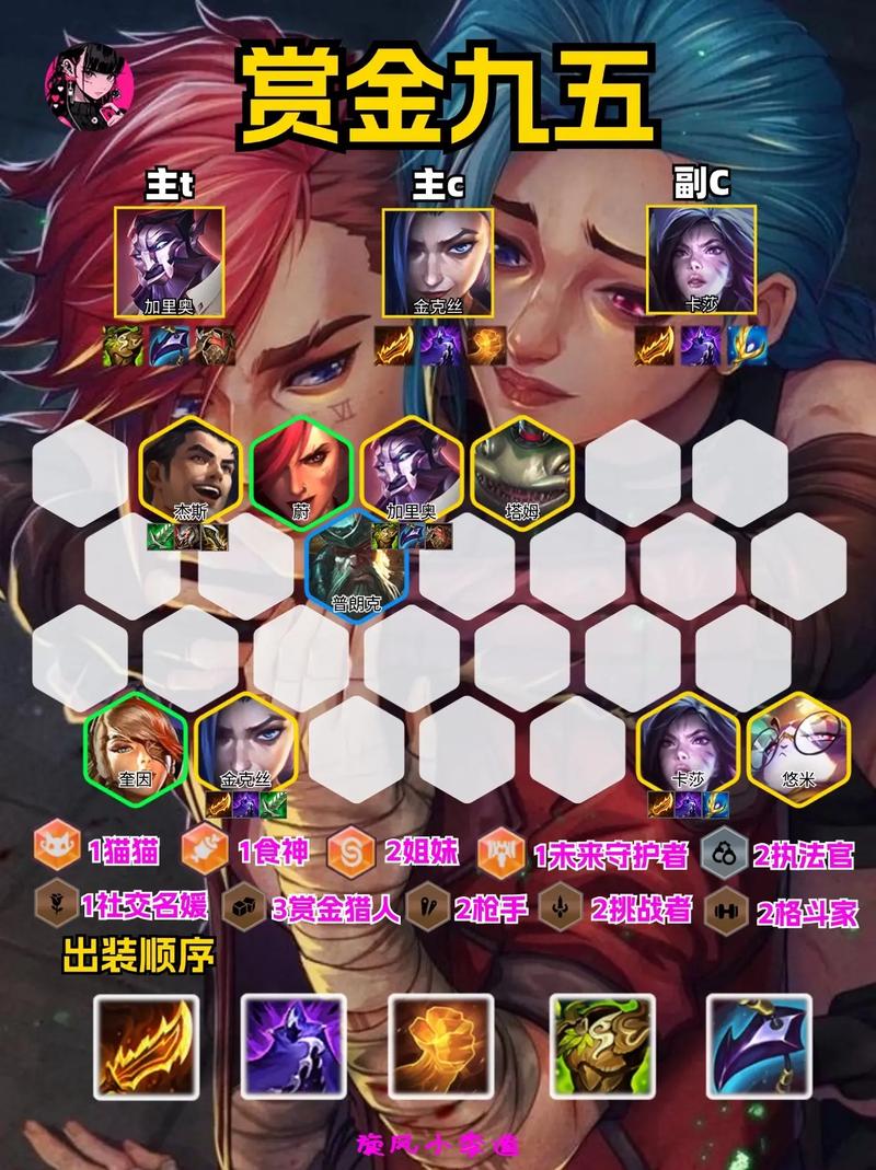 〖Three〗、金铲铲之战6狙5执法阵容玩法推荐阵容组成、装备及海克斯介绍9人口阵容:女警、艾希、猪妹、女枪、烬、蔚、杰斯、泽丽、发条装备方面:水滴/棒子/腰带开,主找前排装和女枪三神装电刀、帽子、巨杀;女枪装备没有也没关系,速八找泽丽随便带点装备就很强。