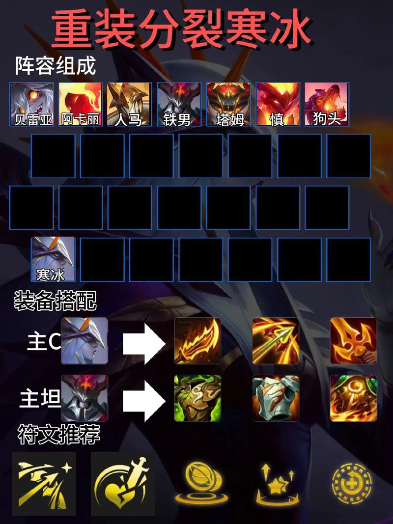 〖Four〗、阵容构成 无敌流阵容的核心为“黄金战神帝国卡特”,具体构成为:卡特、诺手、铁男、派克、劫、盖伦(不三星可换猪妹)、波比、永猎双子、冰鸟(可单挂)。羁绊为4骑士、3刺客、2帝国、2暗影。装备搭配 卡特:复活甲(或狂徒)、水银(必备)、科技枪(或离子火花,但科技枪更优)。