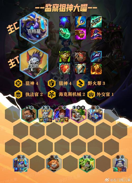 〖One〗、装备推荐:主C金克斯的装备首选羊刀、巨杀和正义之拳/饮血剑,巨杀克制3星阵容,回复装备根据情况选取正义之拳或饮血剑。副C维克托需窃贼手套、青龙赌+法爆+巨杀,启动装优先青龙刀或蓝BUFF,其他装备搭配巨杀即可。主坦杰斯的装备应优先考虑反甲、龙牙/石像鬼板甲、救赎/狂徒,根据手头资源做出防御装备。