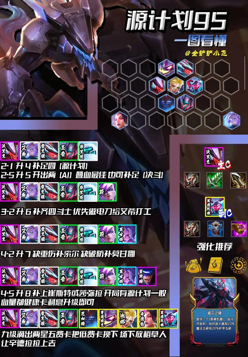 羁绊组合为:9恕瑞玛、2暗裔、1女皇、1主宰。开局推荐转职海克斯,或在自助餐厅、书库时选取该阵容。强化符文优先选取恕瑞玛转职以提升羁绊层级,两个转职建议为升级咯和最后储备,可提升速9效果。恕瑞玛圆盘可增强伤害,正义之手适配剑魔装备。