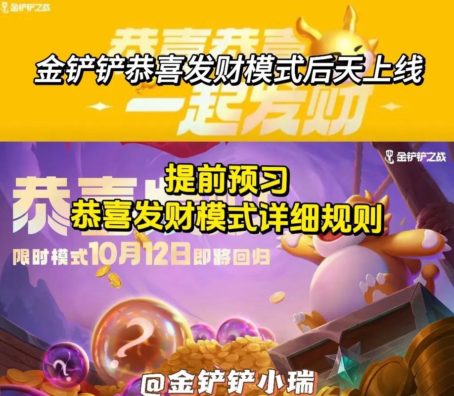 〖Six〗、金铲铲之战中并未设有恭喜发财模式,该模式存在于云顶之奕中。恭喜发财模式预计在2023年2月13日结束,届时将在13版本的更新中被移除。13版本的更新计划在2月14日进行,并已顺利完成。玩家在春节期间参与云顶之奕模式时,可以体验到恭喜发财模式带来的特别内容。