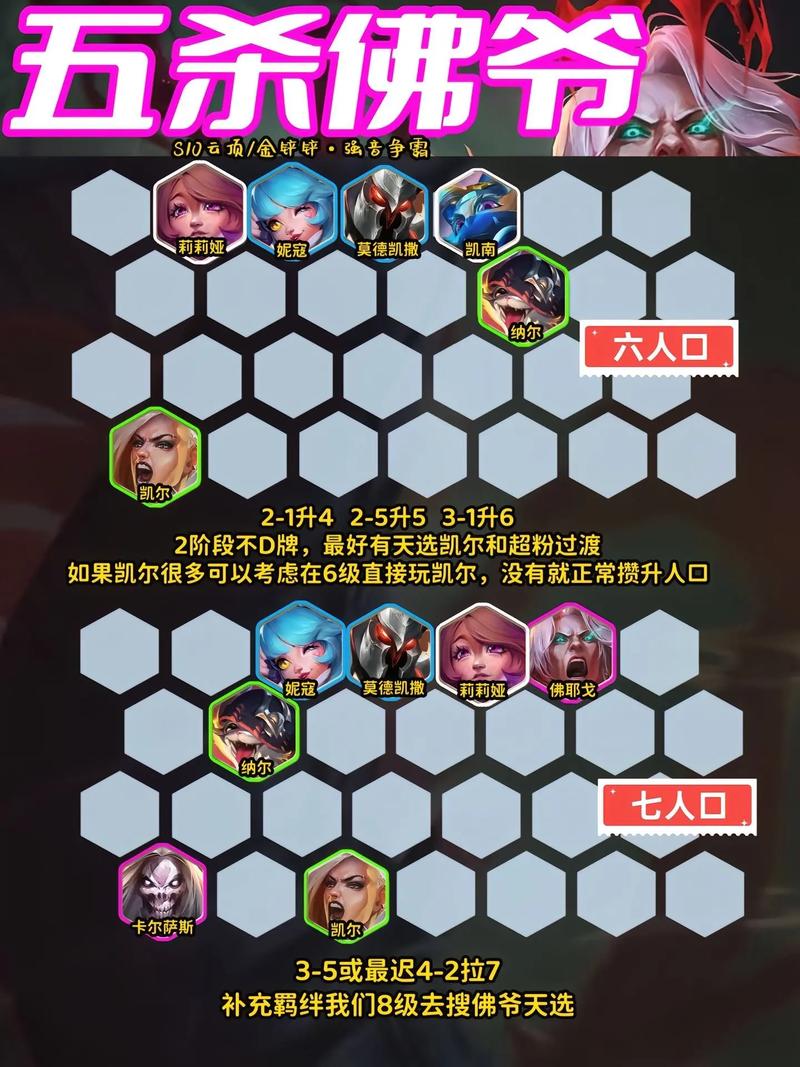 〖Three〗、-5阶段上七人口大搜,优先收菜英雄包括卢锡安、普朗克、玛尔扎哈、泰达米尔等,最推荐名流枪阵容。八人口成型后,优先考虑格斗前排搭配奎因泰达米尔,选取精密/高挑德子,442希维尔,斗毒烈娜塔等作为收菜选项。尽量少贪赏金,若能锁血则立即转阵容,根据战力、来牌、装备和血量判断收菜英雄和阵容。