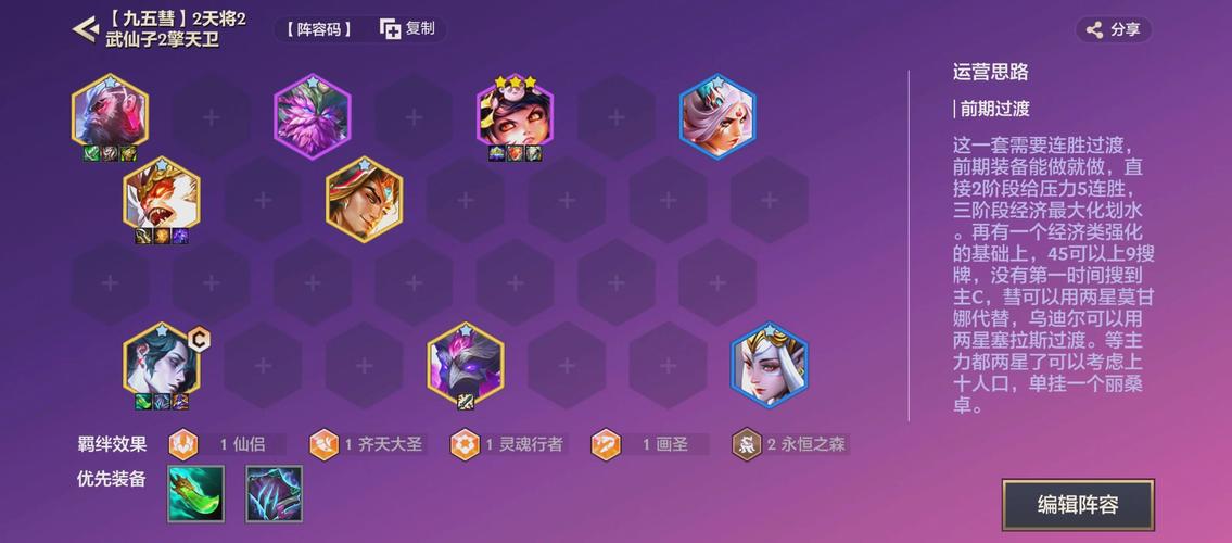 阵容搭配 弈子:薇古丝、卡密尔、莫甘娜、洛、娜美、基兰、诺拉、米利欧、卡尔玛这套阵容是偏后期的九五阵容,相对其他阵容来说比较吃血量与经济运营能力,但阵容大成后续航与控制能力超强。