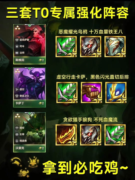 〖Three〗、阵容组成与羁绊英雄构成:皮城执法官(蔚)、虚空恐惧(大虫子)、虚空遁地兽(挖掘机)、蒸汽机器人、齐天大圣、雷霆之主(狗熊)、冰川骑士(猪妹)/灵鸟毕方(冰鸟)。核心羁绊:6斗士:全员获得高额生命值加成,提升阵容坦度。2北地:普攻有概率冻结敌人,增强控制能力。