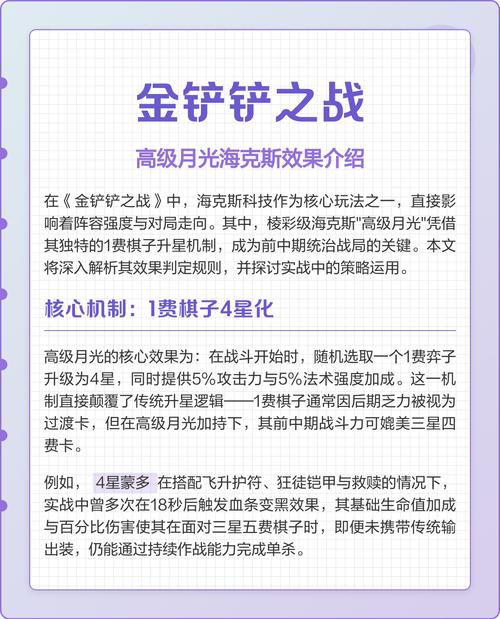 《金铲铲之战》中海克斯规律是指游戏内英雄的羁绊或职业,在满足特定条件下会得到加强,从而产生额外的战斗能力。以下是关于海克斯规律的详细解释:海克斯科技的力量 在《金铲铲之战》中,海克斯科技是一种核心游戏机制,通过特定的英雄羁绊或职业组合来触发。