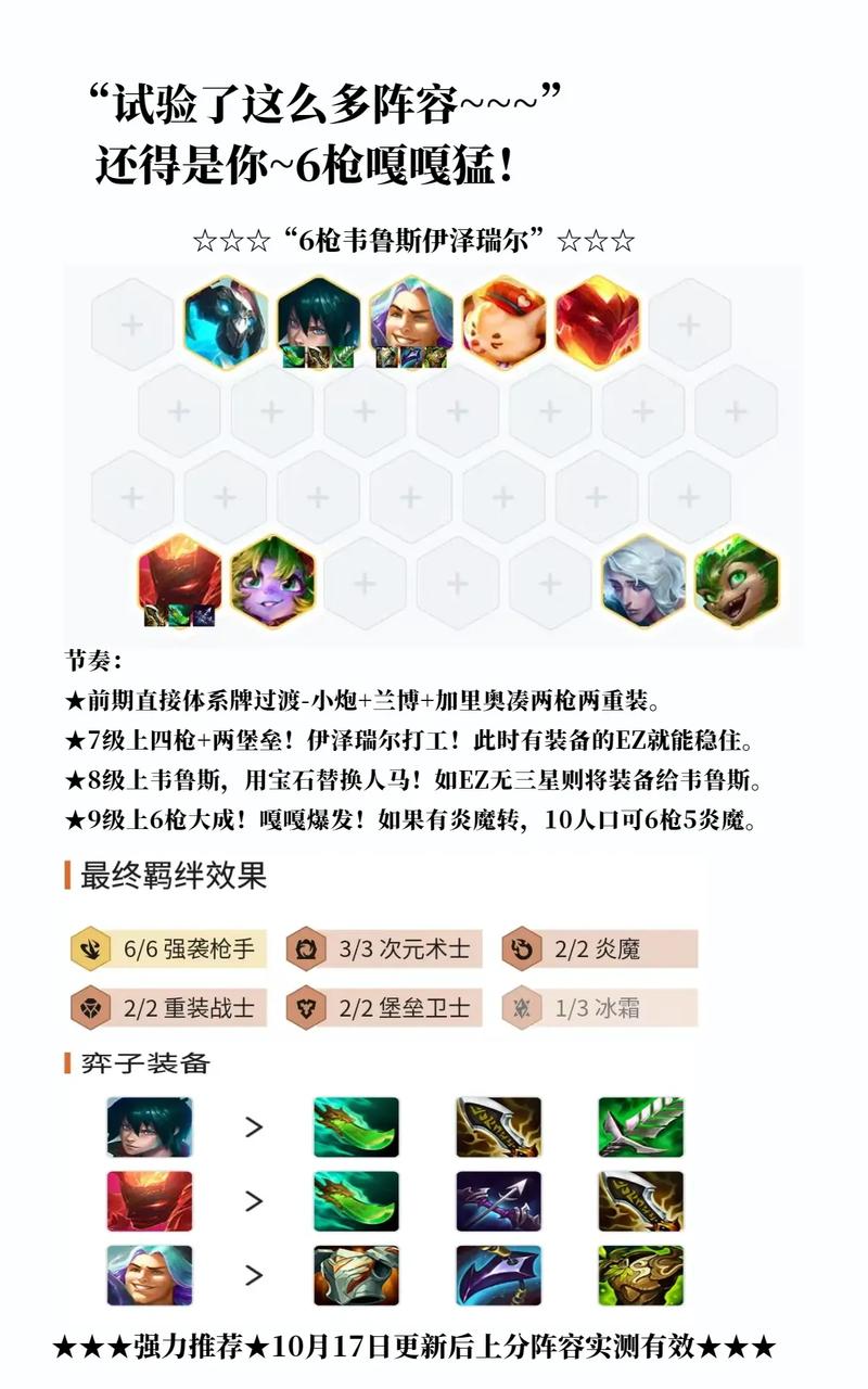 核心:刀妹。装备:刀妹必备无尽,巨杀可替代,芬妮需要青龙刀。炼金格斗阵容:核心:六格斗家,烈娜塔为主要输出。后期:可上维克托作为主要输出。极客刀妹发明家阵容:核心:刀妹。装备:刀妹必备无尽,建议回血刀,后期芬妮需要鬼书,杰斯需要肉装。