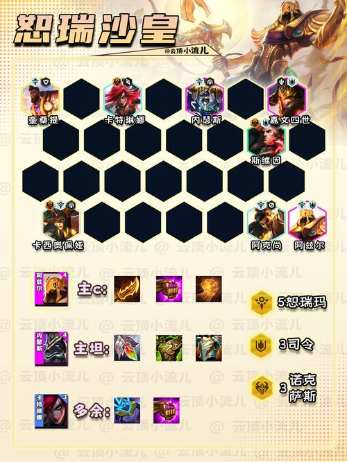 〖Three〗、在金铲铲之战S9赛季中,皮尔特沃夫阵容以黑默丁格为核心,搭配瑟庄妮、杰斯、赛恩、奎桑提、瑞兹、赛娜、丽桑卓、蔚等英雄。黑默丁格作为主C,其必备装备是羊刀和巨杀,若条件不允许,可以替换为三个羊刀。瑟庄妮的装备包括狂徒、荆棘背心和石像鬼石板甲,为队伍提供持续的坦克支持。