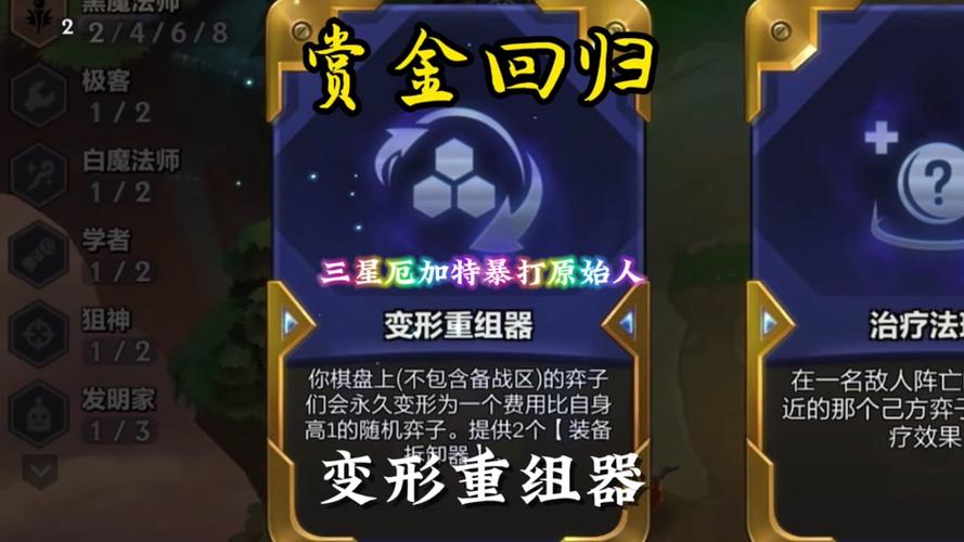 〖Six〗、变形重组器出现阶段:变形重组器这个金色海克斯在3-3阶段和4-6阶段都有可能刷出。 变形重组器效果:它是一个白银海克斯科技,效果是你场上的弈子会永久变为比原始费用高1费的随机弈子,并且你还会获得两个装备拆卸器。