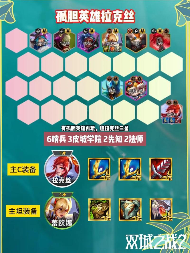〖Two〗、金铲铲之战拉克丝作为主c的玩法攻略,具体如下:阵容组成:拉克丝、女坦、剑魔、辛德拉、芮尔、大眼、艾翁和泰坦。这套阵容拥有6圣光卫士、2铁甲、2骑士和2神谕者。6圣光能提升拉克丝的生存能力和输出能力,铁甲和骑士则增强整个阵容的防御力,而神谕者能使得友军在攻击时获得法力回复。