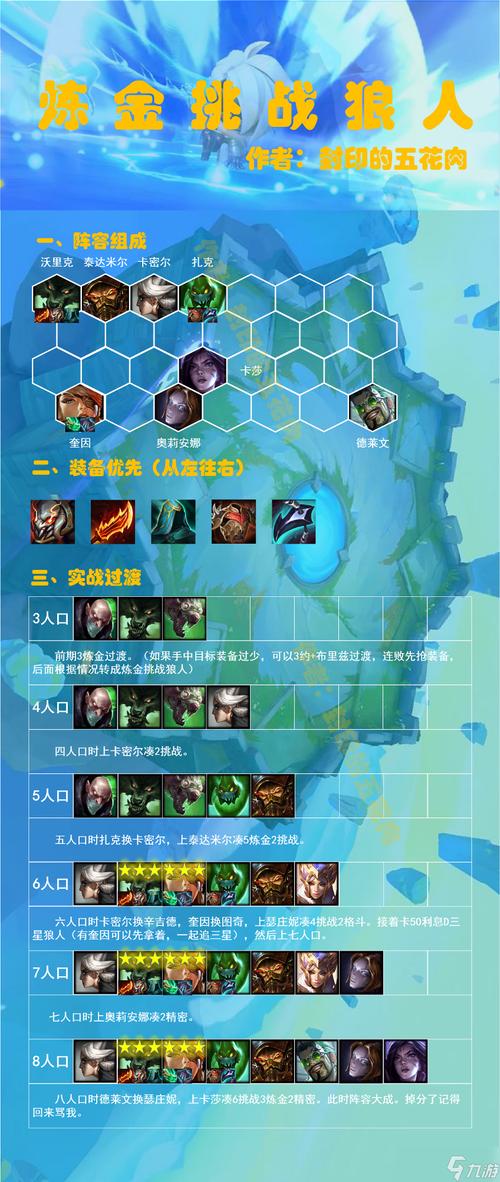 炼金挑战狼人的阵容中,狼人担任主C角色。除了狼人,该阵容还需要前排英雄扎克,副C奎因,泰达米尔,卡蜜尔,奥利安娜,德莱文,卡莎等共计八人口,组成6挑战者,3炼金科技,2精密发条的配置。海克斯优选炼金之冕,挑战者之冕和即时注射等装备。