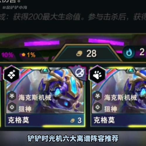 〖Two〗、第一关,推荐选取二星时光的阵容。装备初期可以暂不给予,海克斯强化选取星界赐福,这能有效提升团队的回复能力。第二关同样选取二星时光的阵容,目标是凑齐四精密和三发明家的羁绊。此时海克斯强化应选取精密发条之徽,这个强化会分别给炼金和发条装备冰心和女妖之爪,增加它们的生存能力。
