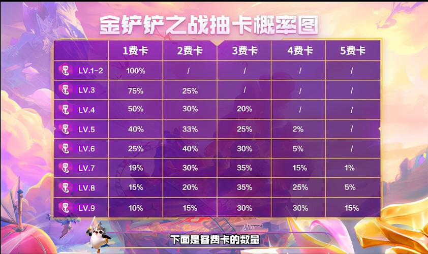 - 4级:55%为1费卡,30%为2费卡,15%为3费卡。- 5级:45%为1费卡,33%为2费卡,20%为3费卡,2%为4费卡。- 6级:35%为1费卡,35%为2费卡,25%为3费卡,5%为4费卡。- 7级:22%为1费卡,35%为2费卡,30%为3费卡,12%为4费卡,1%为5费卡。