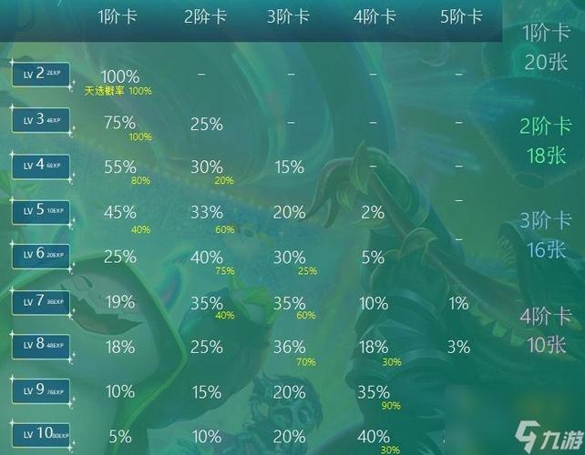 级 19 30 35 15 1 8级 15 20 35 25 5 9级 10 15 30 30 15 卡牌数量 1费卡:29张 2费卡:22张 3费卡:22张 4费卡:18张 5费卡:10张 根据表中数据可知,刷牌的概率会随着等级的提升而变化,4费人口要升到5级才会刷出,5费人口要升到7级吃安徽刷出。