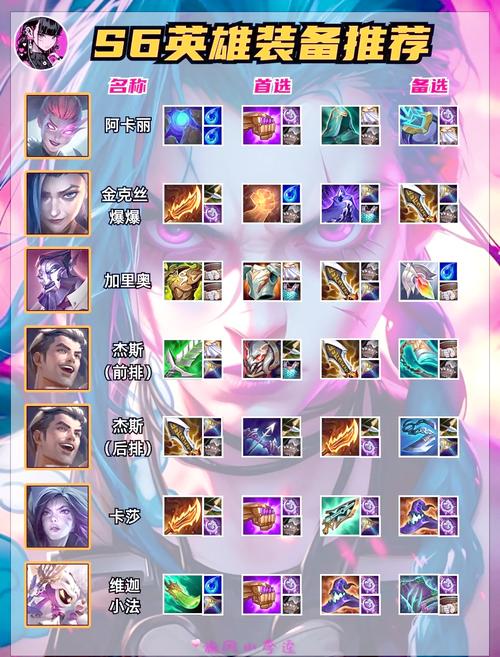 机器人:腰带、魔抗、锁子甲。艾克:冰心+鬼书,散件如冰心+大棒/腰带或鬼书+锁子甲/水滴。炸弹人:水滴、魔抗、腰带。刀妹:偷偷或拳套、腰带、魔抗、锁子甲、宝剑。杰斯:轻语可极大增加金克丝输出效率。维克托:后期捡垃圾,如果阵容法强装备多前中期可给予炸弹人后期转给维克托。