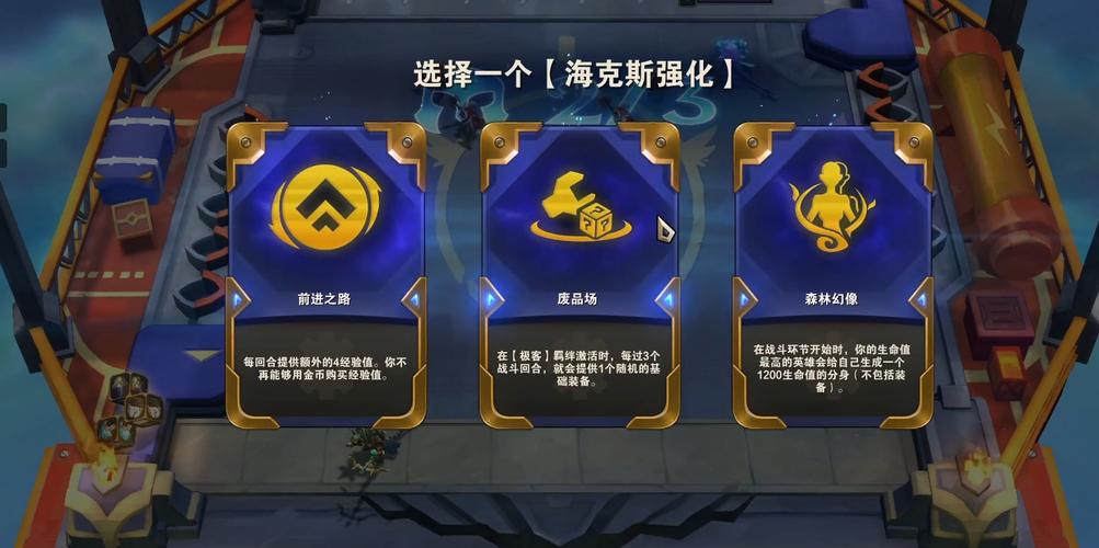 〖Two〗、“海克斯强化”是一种在指定回合中给到弈士自由选取的全局效果,既可以是获得某种道具、装备,也可以是让某类棋子添加buff,甚至还能更改战场规则,为紧张刺激的对弈展现更多战术可能性,也为战局增加了更多的可能性。解析:一句话介绍是一种道具,属性型战斗增强玩法,可以增加游戏更多的随机性和可玩性。