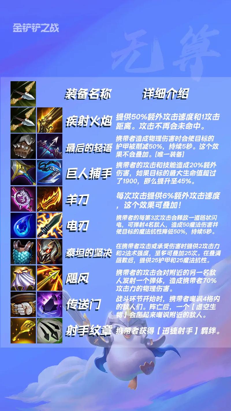 金铲铲之战S9赛季于6月16日更新,玩家反馈上分效果显著。为了帮助大家更好地应对新版本,我们总结了一份详细的S9赛季装备合成表,包括特殊装备的属性和来源。