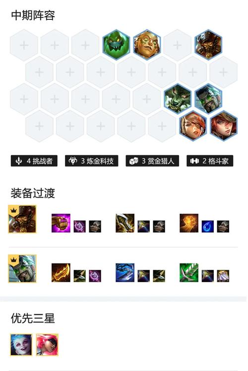 海克斯:优先海克斯转职和粉碎器,没有的话续航类、经济类也可以考虑。『4』早期过渡:2-1拉4,2-5拉5,前期有海克斯牌就直接用4海克斯过渡,用低费海克斯卡或者其他单挂棋子带装备,有1-2个2星基本都能连胜;没海克斯的话就吃约德尔,飞机带装备过渡。
