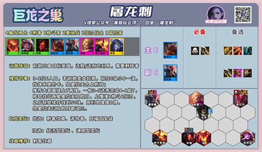 金铲铲之战中,天龙风女阵容成为新版本的上分利器。该阵容由慎、婕拉、风女、黛安娜、李青、奥恩、莫甘娜、孙悟空和洛组成,具备4/5天龙4圣贤2幽魂2擎天1仙侣1大圣的羁绊。转职优先选取天龙之子纹章,可直接激活5天龙羁绊,增强队伍实力。
