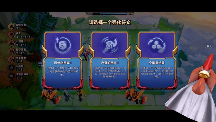 变形重组器的使用顺序为:金色→英雄→银色;银色→金色→银色。这意味着在使用时首先应选取金色,其次选取英雄,最后才是银色。这一顺序在游戏过程中非常重要,因为不同的顺序会直接影响到角色的强化效果。在第二阶段,建议玩家先确定一个想玩的阵容,避免一开始就使用低费卡进行赌博式游戏。