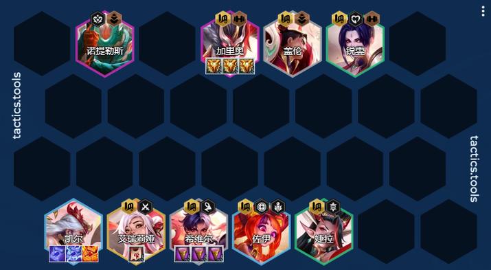 阵容由主C拉克丝、马尔扎哈、斯维因、加里奥、维克兹、塔里克、嘉文四世和阿狸组成,羁绊为六法师、三德玛西亚、二司令。这套阵容核心为依靠前排所有人携带灵风将敌方前排全部吹起,再由主C拉克丝单点高爆发将敌方C位瞬间秒杀。