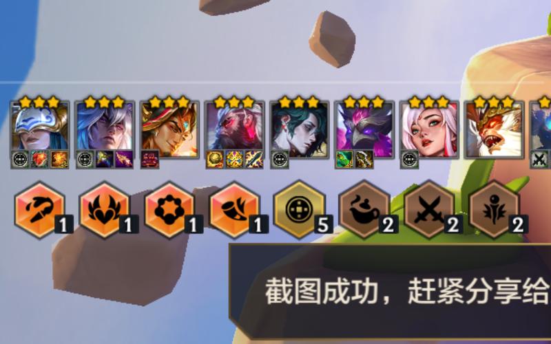 〖Three〗、连败后利用经济和装备拉满8人,装备全部合成后开始连胜,并在3-5阶段拉到9人,存够50元以上的元宝,开始合成5费天选,推荐英雄如下图所示。对于猩红连胜,前期只需保留猩红之月牌,在2-5时拉到5人。装备能用的全部合成,前期不留散件,一定能保住连胜。