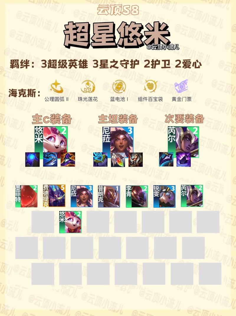 在《金铲铲之战》中,构建一个强大且平衡的阵容至关重要。以6吉祥3超英2爱心为例,悠米、加里奥、石头人、狗头、李青、牛头、努努、普朗克这八名角色可以组成这样的羁绊。