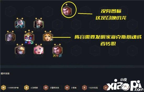 〖Three〗、阵容由艾克、辛吉德、EZ、基兰、杰斯、烬、泽丽和萨勒芬妮组成,站位如下图示。羁绊为7发明家、狙神、机客、精密发条、1社交名流。由于新增龙蛋机制,必定需要纹章之书。若纹章之书开出发明家转职,就玩5发明家4精密。