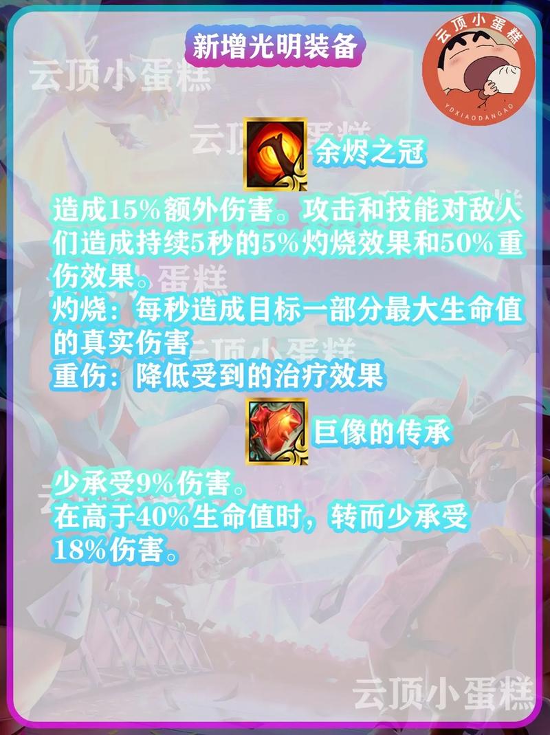 〖Five〗、潘多拉的装备,获得一个散件,每回合开始时,装备区的散件、成装、转职书都会随机变化。转职书也是会变的,不仅是铲子能合成的转职书会变,并且这东西还能把转职书给换成不能转的,比如赏金发明家,强玩某阵容最佳海克斯。