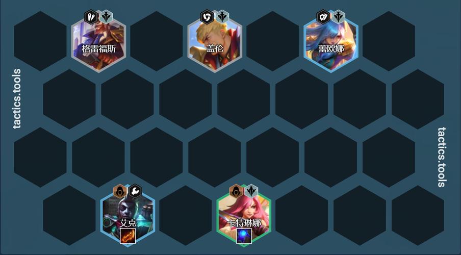〖Two〗、阵容搭配:选取盖伦『1』、机器人『2』、曙光『3』、永恩『4』、猫咪『5』、艾克『3』、拉克丝『4』和卡特『2』。主要构成六个战斗学院,能叠加10点双攻。卡特蓝量较少,但3星后杀人可回40点蓝,技能刷新频率高,叠加学院羁绊非常迅速。其余棋子带装备可作为辅助输出,阵容基本不惧任何组合。
