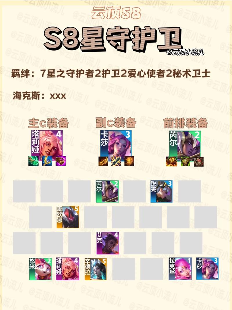 猫咪、芮尔、尼_、琴女、安妮、牛头、瑞雯。组成3星守2爱心2灵能2福牛2吉祥2护卫羁绊。整套阵容的强势在于琴女、尼_的双回复,猫咪技能的点杀效果。