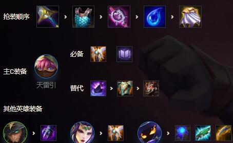 装备方面我们需要拿到两件火炮 饮血剑 破败王者之刃 红BUFF,作为射手输出阵容攻速装备必备选取,饮血剑搭配德莱文给予很出色的续航输出,最后红BUFF搭配亚索给予的灼烧效果表现可观。