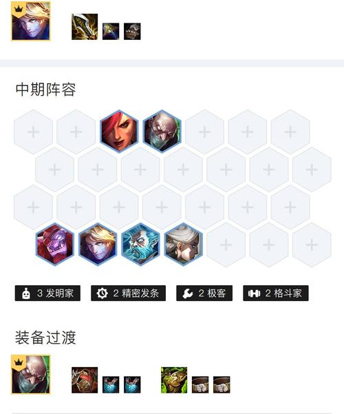 前期,玩家应优先搜集到反曲弓和大剑这两件关键装备,为后续的阵容搭建做好准备。过渡阶段,推荐玩家先尝试构建2斗士搭配2骑士或2游侠的阵容,以便在初期稳固战局。进入中期,首先应将复活甲和飓风等装备合成为金克斯所用,同时准备好其他角色作为“打工仔”使用。