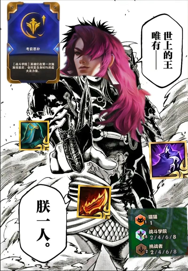 阵容搭配:选取盖伦『1』、机器人『2』、曙光『3』、永恩『4』、猫咪『5』、艾克『3』、拉克丝『4』和卡特『2』。主要构成六个战斗学院,能叠加10点双攻。卡特蓝量较少,但3星后杀人可回40点蓝,技能刷新频率高,叠加学院羁绊非常迅速。其余棋子带装备可作为辅助输出,阵容基本不惧任何组合。