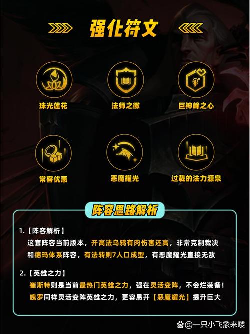 〖Two〗、装备方面:主养凤黯,龙牙、泰坦、反甲。没有龙牙要被三星布兰德/卢锡安暴揍,泰坦增强上限;输出位找马尔扎哈青龙刀、鬼书。海克斯方面:学者/变异/格斗/法师相关转职均可,7级能开出相应的高羁绊;羽量级、赌狗经济类相关;电火花和战斗法师对其他阵容鸡肋,很适合赌学者乌鸦这套。