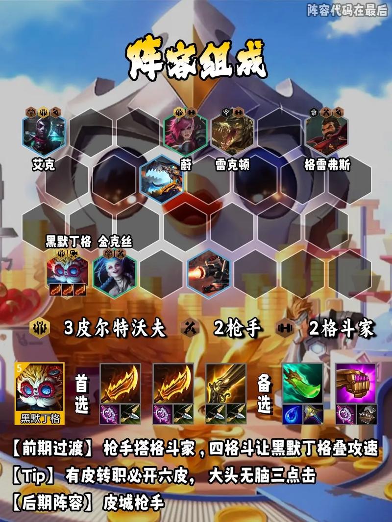 推荐的阵容包括扎克、丽桑卓、塔姆、蒙多医生、蔚、厄加特、维克托、金克丝和杰斯,可以组成5炼金4格斗2枪手羁绊。在装备选取方面,首先推荐金克丝作为主C位,建议配备羊刀、巨杀,复活甲作为备选,还可以考虑法爆或正义等装备。副C位推荐蒙多医生,建议配备狂徒铠甲、反甲、龙爪等肉装以增加生存能力。