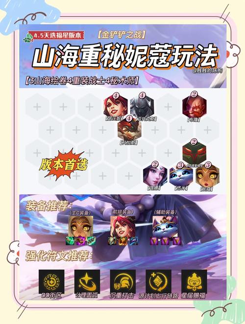 金铲铲之战中的重装妮蔻阵容由妮蔻、泰坦、剑魔、奥恩、大虫子、猪妹、悠米和凤女组成。该阵容的羁绊包括3山海、1铁匠、4秘术和4重装战士。前期主要看天选牌,根据天选牌搭配选取打工阵容。摩昂建议使用2重装3三国2神盾或者腥红过渡。天选优先选取妮蔻,以提升妮蔻的输出能力。
