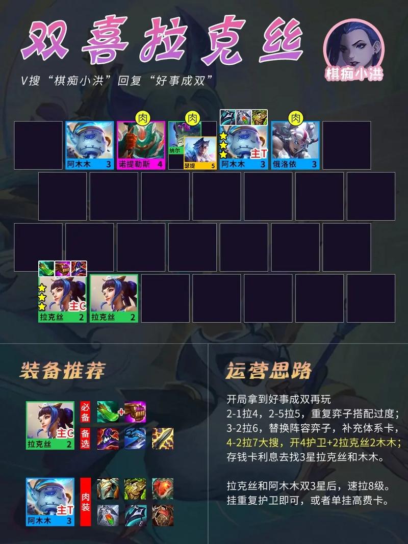 〖Two〗、核心玩法在于保证经济与血量健康,使用利息升级或搜寻关键棋子。通常在3-2时升6级,4-1时升7级,4-5时升8级。前中期追求连胜,考验游戏理解与过渡能力。前期使用4海克斯2强袭2格斗过度,寻找希维尔装备强力的打工旗子,如飞机、卢锡安等。优先升人口,力争连胜。