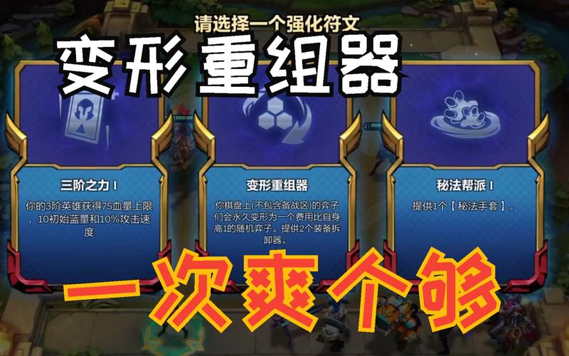 〖Three〗、云顶之弈海克斯强化中变形重组器是没有办法提高出现概率的,变形重组器是一个一阶的海克斯羁绊,这是随机刷新的。变形重组器效果介绍:选取该海克斯后,当前棋盘上的棋子将会永久变为一个比自身高1费的随机棋子,同时会提供2个装备拆卸器。云顶之巅,聚梦之所。