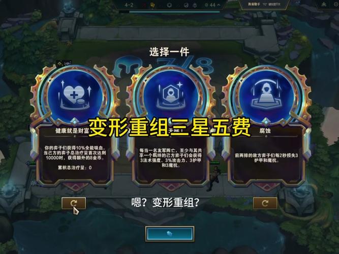变形重组器的使用顺序为:金色→英雄→银色;银色→金色→银色。这意味着在使用时首先应选取金色,其次选取英雄,最后才是银色。这一顺序在游戏过程中非常重要,因为不同的顺序会直接影响到角色的强化效果。在第二阶段,建议玩家先确定一个想玩的阵容,避免一开始就使用低费卡进行赌博式游戏。