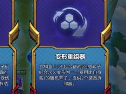 金铲铲之战变形重组器攻略这是一阶的海克斯羁绊,会随机刷新,在4-6的时候刷新几率最大,4-6之后刷新的概率就会变得很小。作用是将场上所有棋子永久变为随机高一费英雄,并且获得2个装备拆卸器。