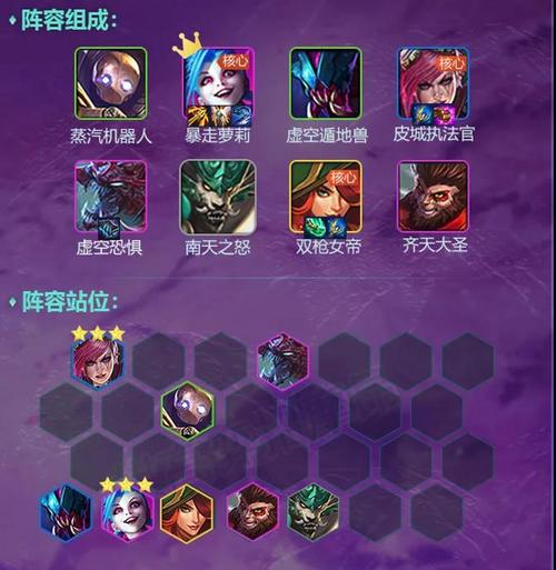 双枪女帝+虚空恐惧+齐天大圣+暴走萝莉+皮城执法官+南天之怒+蒸汽机器人+虚空遁地兽 触发羁绊效果:1机器人+6斗士+2虚空+2狂野+2海克斯科技+2枪手 斗枪阵容装备:装备优先度:反曲之弓暴风大剑锁子甲巨人腰带女神之泪 分析:首选攻速刀,为暴走萝莉做装备。