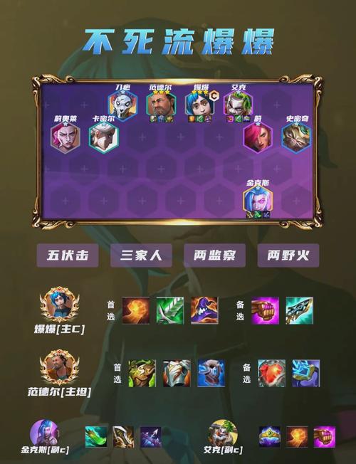 EZ:蓝霸符+巨杀+法强装备EZ蓝霸符必备,可极大增加技能释放频率,是阵容输出强度的保证。第二件装备建议巨杀,这套阵容的关键是快速过墙,只要清理掉敌方关键前排,EZ就可一次技能清理掉一枚敌方棋子。