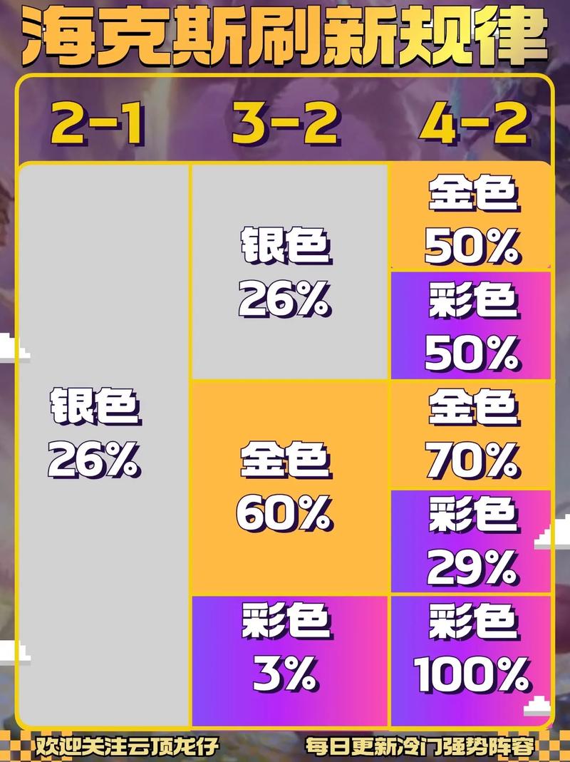 《金铲铲之战》海克斯颜色出现规律如下:银银金(30%)、银银彩(9%)、银金金(15%)、银金彩(4%)、银彩银(4%)、金银银(10%)、金银金(10%)、金金金(4%)、金银彩(4%)、金金彩(4%)、彩银金(2%)、彩金金(2%)、彩银彩(1%)、彩彩彩(1%)。