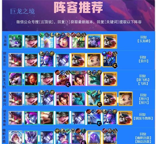 〖Two〗、金铲铲之战上分阵容推荐——驯龙赛芬组合:核心棋子:黑默丁格、崔丝塔娜、璐璐、塞拉斯、赛芬、佐伊、巴德和索拉卡。羁绊搭配:3驯龙大师、1龙神、1窃法巧手、1唤星者、4幽影龙、2格斗家和2魔导师/3法师,形成强大的协同效应。