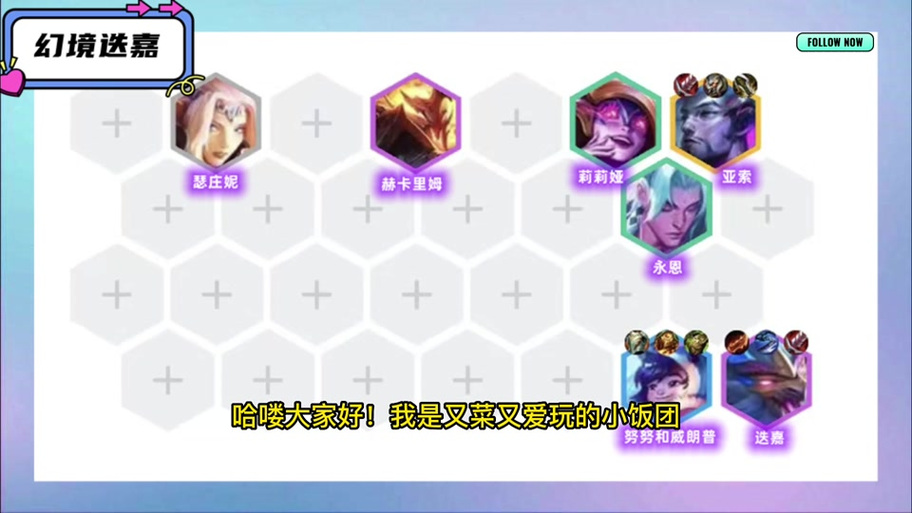 〖Five〗、阵容构建核心阵容包括猪妹、莉莉娅、永恩、雪人、人马、迭嘉和亚索。通过这些角色的搭配,形成相应的羁绊和战术。装备选取迭嘉:必备鬼刀和巨杀,根据幻境效果选取其他装备,如水银防控制、法爆提升输出、帽子提升法强等。在特定幻境下,电刀或羊刀和正义法装也是可选项。