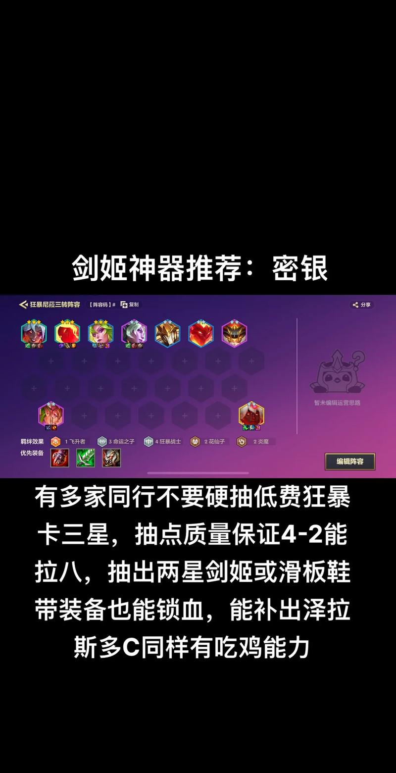 〖Two〗、推荐的阵容包括拉克丝、莫甘娜、娜美(替换为任意决斗大师若天选之人是玉剑仙)、剑姬、泰隆(男刀)、艾瑞莉娅(刀妹)、猫咪、迦娜(风女)。剑姬作为天选之人,是最终阵容的核心。如果天选之人是玉剑仙,则娜美应替换为任意决斗大师,以发挥玉剑仙普攻回蓝快的特点,以及猫咪和风女的强力回复能力。
