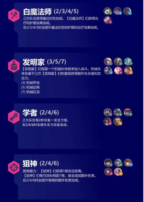 金铲铲之战双城传说阵容推荐包括七发明家巨龙登场、黑玫体系、哨兵体系以及极客体系等。首先,七发明家巨龙登场阵容是一个成型后非常强势的选取。这个阵容以塔里克为主坦,萨勒芬妮为主C,杰斯为副C,配合其他发明家和辅助棋子,可以形成强大的羁绊效果。